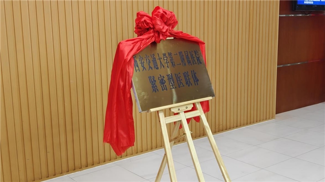 西安交大二附院戴一副院长、杨惠云主任同西安济仁医院严育斌院长、刘三民常务副院长共同为“西安交通大学第二附属医院紧密型医联体”揭牌。